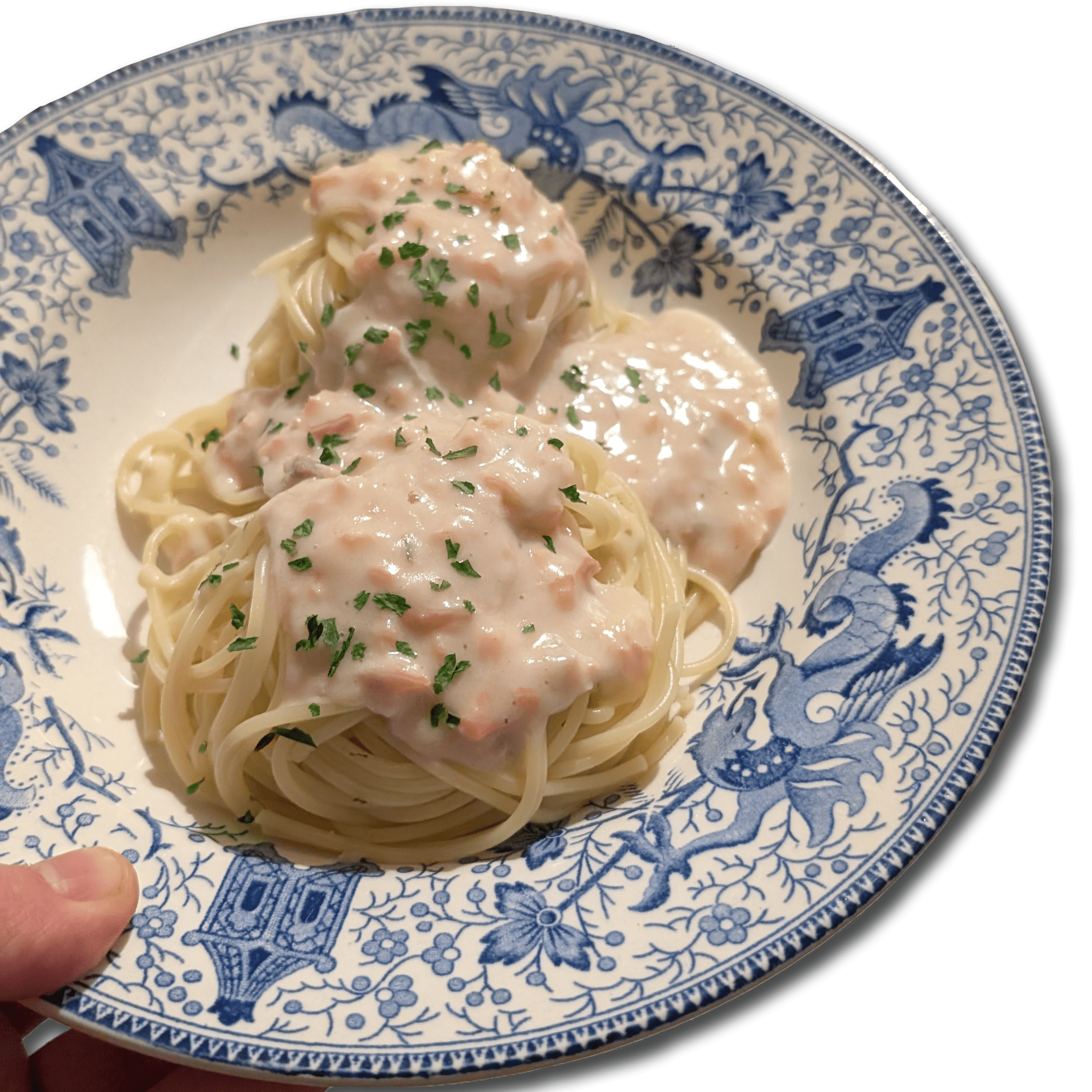 - Once your sauce is a good consistency - thick enough to coat the pasta, not too thick to form clumps - pour a good amount over the spaghetti in a bowl and serve with parsley/chive on top.